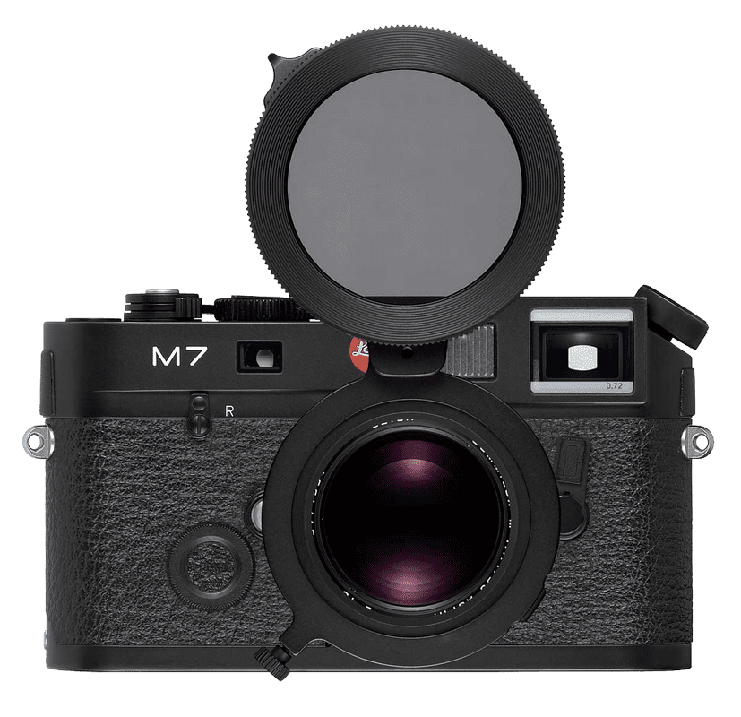 A characteristic of polarization filters is that they show the same effect after each 180-degree rotation. The polarization filter for the Leica M is thus supplied with an adapter with a swivel fitting, allowing it to be rotated 180 degrees to in front of the viewfinder so you can assess and control its effect before taking the shot.