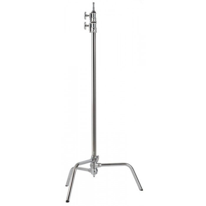The C-Stand has a maximum height of 131″ (333 cm), a minimum height of 50″ (127 cm), and weighs 23 pounds (10 kg). The feet feature non-marring plastic ends to protect floors. At the top of the stand is a baby pin that you can attached the included Grip Head to.