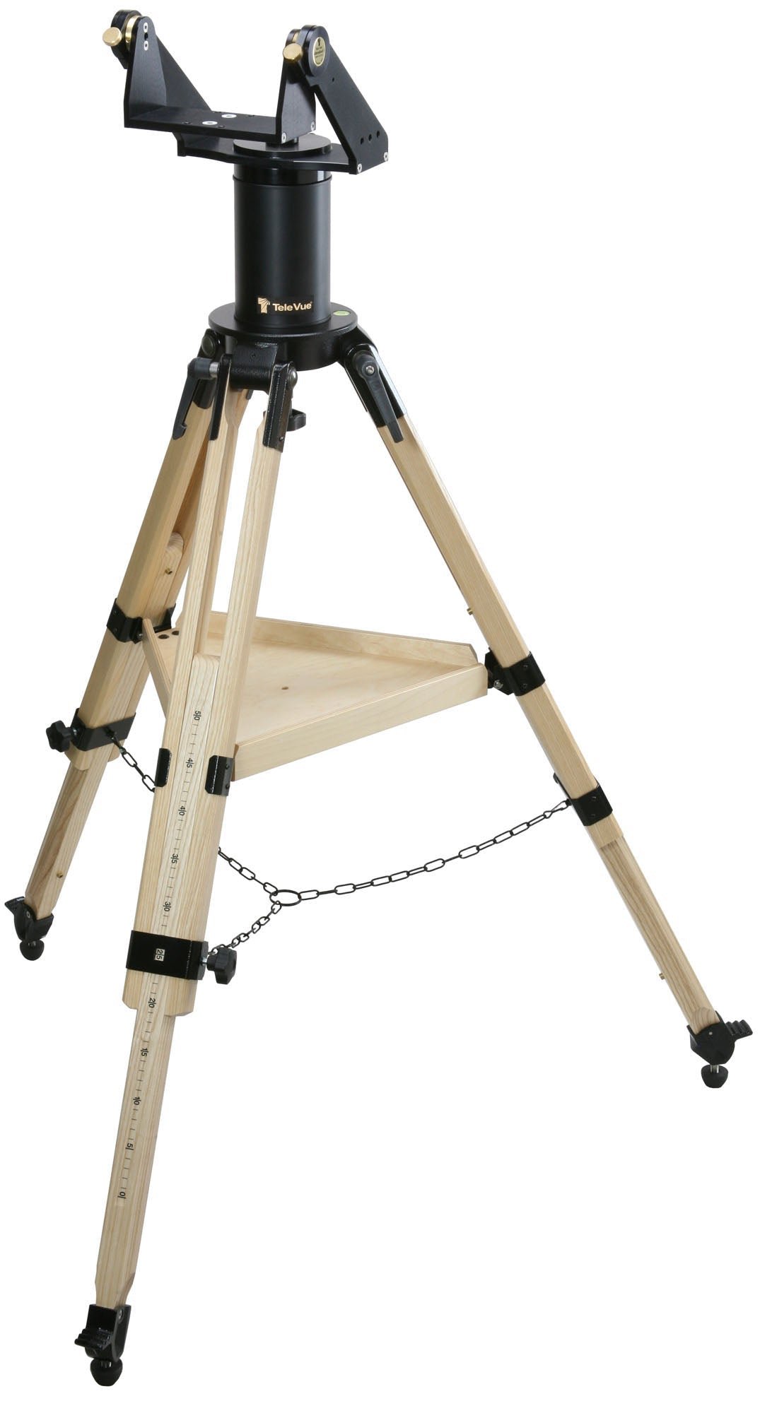 The large bearing surfaces and thick wood legs of the Gibraltar HD tripod handles the load for high power viewing. Leg extensions raise the altitude axis to 5-feet, still ideally sized for use with our Air-Chair observing stool. Scale on leg extensions allows repeatable setting to desired height. A wood accessory tray ties the legs together for rigidity. Built-in pier allows for high-altitude viewing. A bubble-level is integrated into the tripod base. Metal ground spikes with rubber tips are provided. Gibraltar HD5 accepts all accessories including encoders (spacers STS-5002 required to fasten the azimuth encoder cover to the wider baseplate) for object locating with a computer.